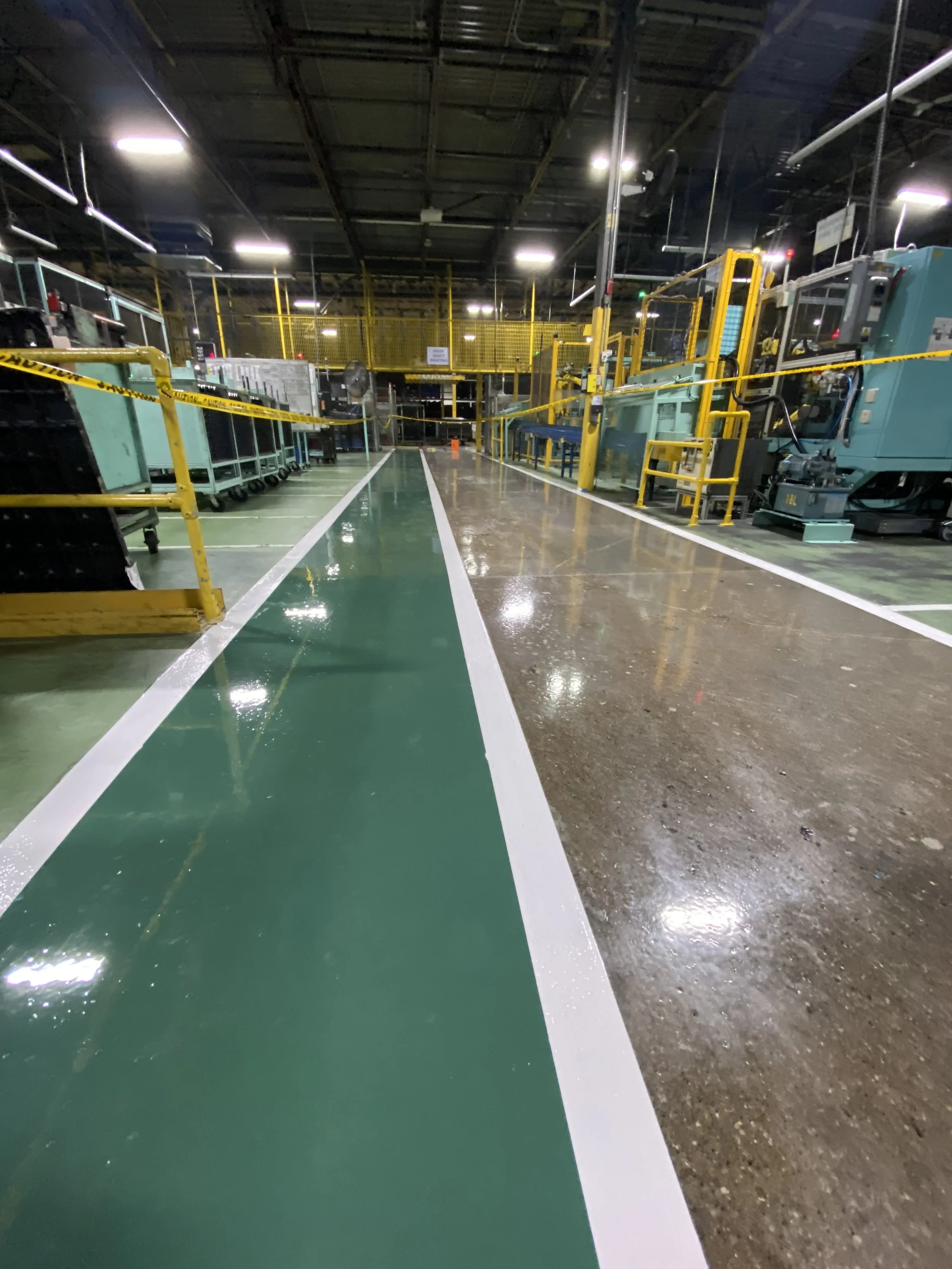 The Epoxy Line Painting System provides a longer lasting & more durable solution when compared to acrylic based line paints, particularly for high traffic working environments. The preparation process includes dustless diamond grinding, precision measured line marking, high adhesion tape at the diameter of choice & is followed by a 2:1 ratio Epoxy blend. It is installed with a 4” reducer on a shot blaster which allows for faster install time, better longevity, & no exposed concrete. This line system is offered in multiple colours & is resistant to abrasion & harsh chemicals. The lines are dry to the touch in 4-6 hours, which allows for minimal inconvenience to facilities. The epoxy line systems can be installed at extremely low temperatures if necessary, both indoors & outdoors (excluding asphalt). Ultraviolet & thermoplastic coatings can be added to the lines to make them more resistant to UV rays due to the sun & extreme temperatures. Luminescent & anti-slip treatments are also available to add to the lines.